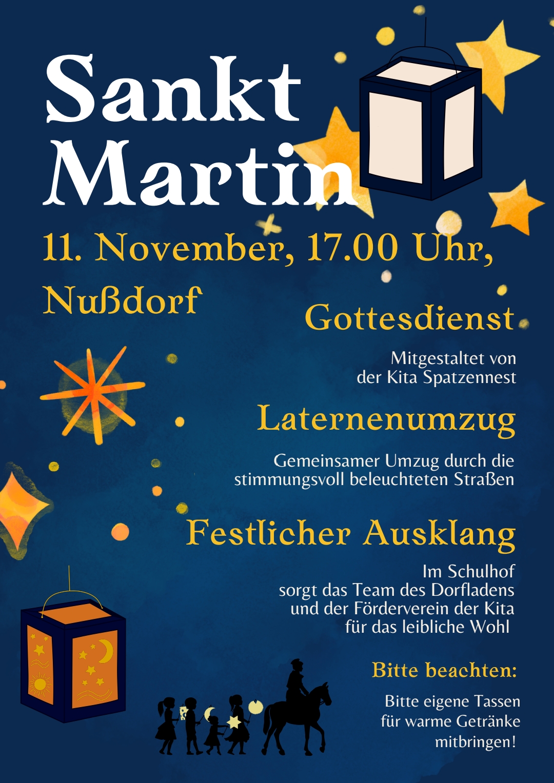 Der Kindergarten ist bereits mit vielen tollen Laternen geschmückt, das nächste Fest lässt nicht mehr lange auf sich warten. St. Martin steht vor der Tür. Auf mehrfachen Wunsch vieler Eltern und nach Rücksprache mit dem Kindergarten und dem Ortsvorsteher findet am 11.11. der St. Martinsumzug statt. Dabei wird es einen Gottesdienst geben und einen Umzug durch das Dorf. Alle sind schon sehr gespannt und freuen sich auf diesen Tag….